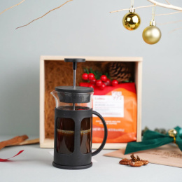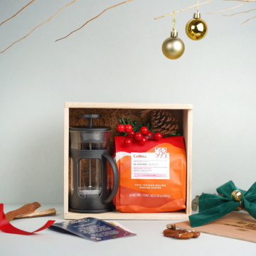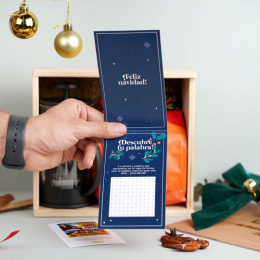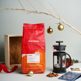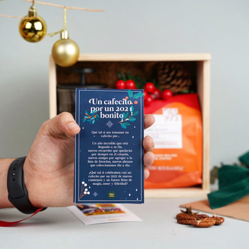 ¡Para los amantes del café! Llegó la cajita más especial de todas para esas personas que aman una buena taza de café en la mañana. Lo más especial de todo es que mientras prepara su taza de café puede escuchar los clásicos infaltables para navidad escaneando el QR en Spotify con una selección de las mejores canciones decembrinas! Incluye: Prensa francesa en vidrio de 350 ml, Café molido Juan Valdéz Colina 454 gramos (Una libra de puro sabor), postal con mensaje de agradecimiento por un 2021 increíble y con una sopa de letras para elegir la palabra que representará su 2022, adorno decorativo navideño, QR para escanear con lista de Spotify con los mejores clásicos decembrinos para escuchar, caja en madera grabada con cinta verde decorativa.