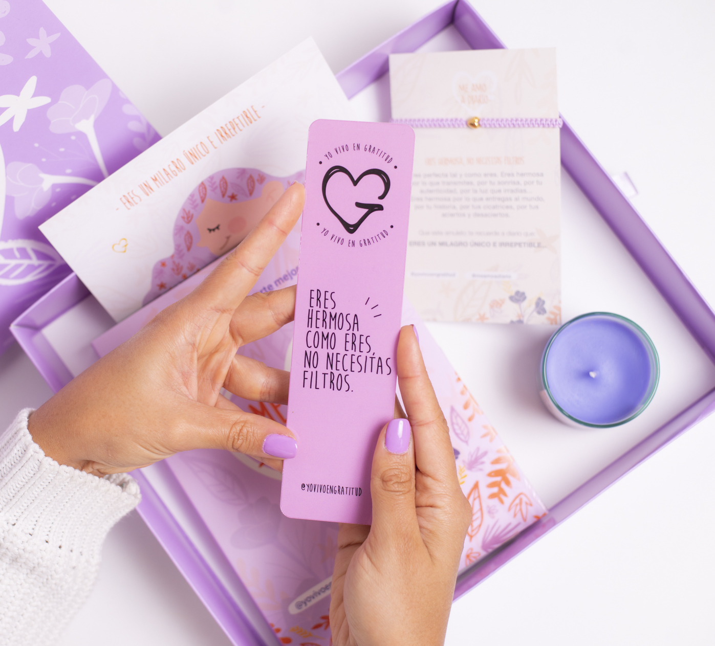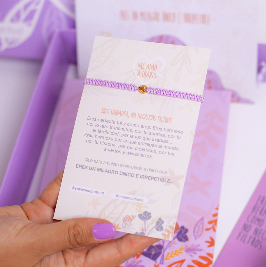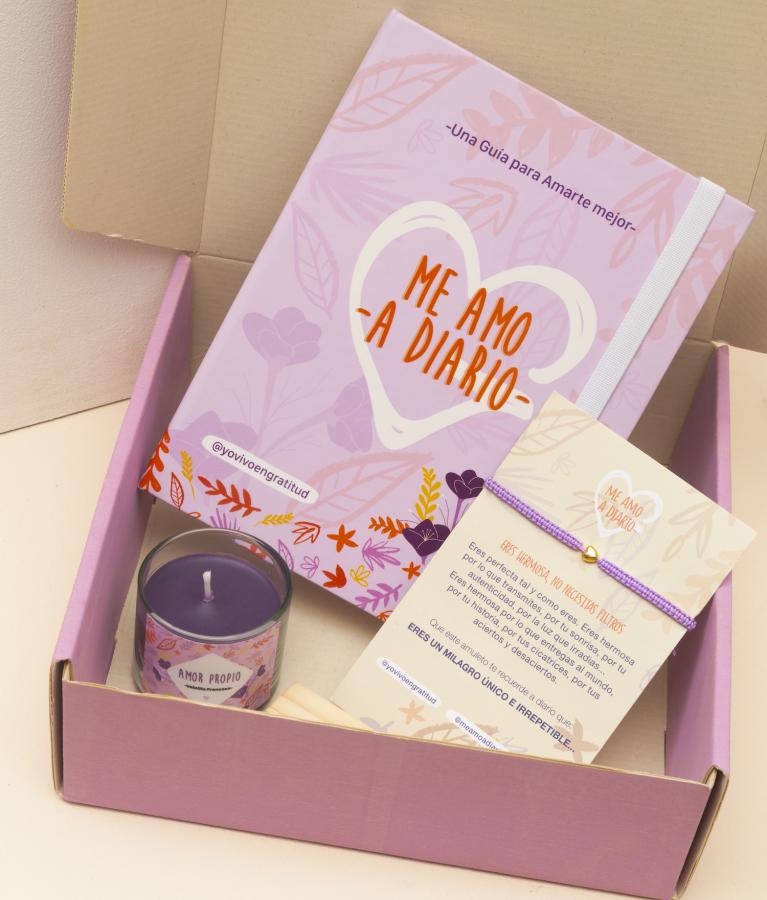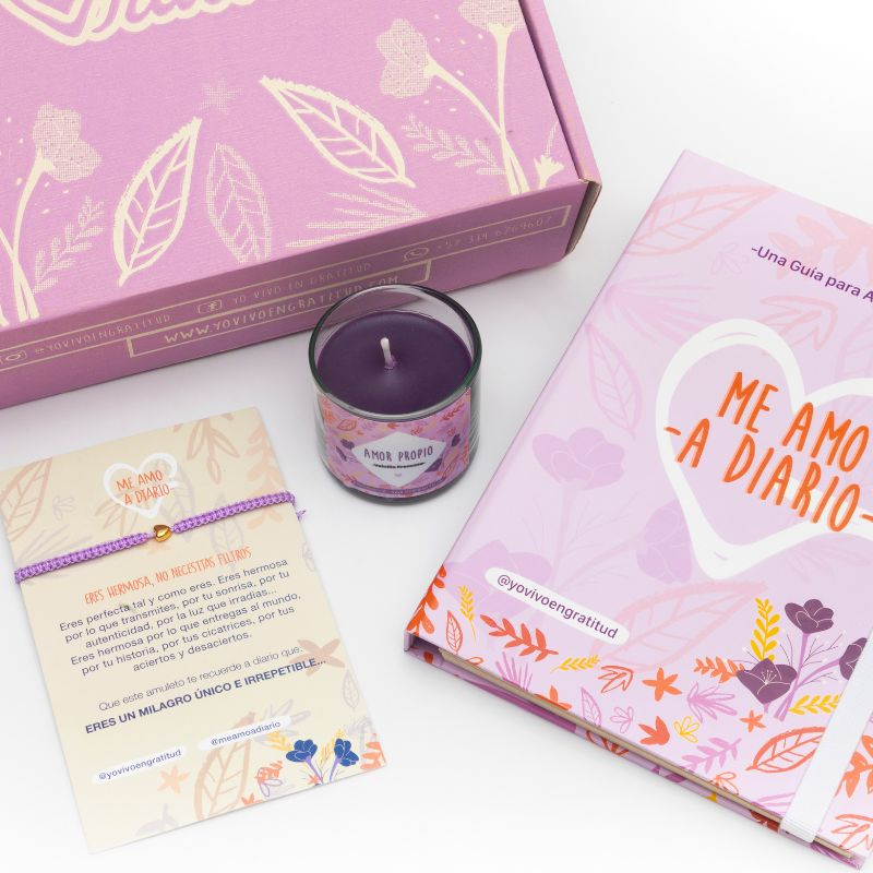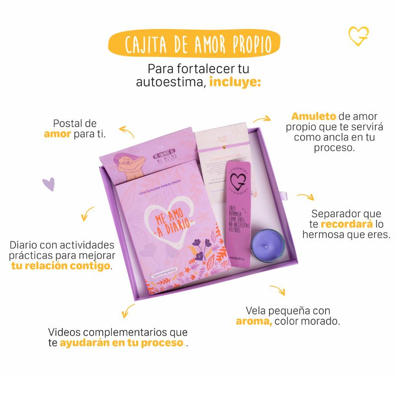 Nuestra Cajita de Amor Propio Incluye: Diario Me amo a Diario: Es un Diario que te ayudará a fortalecer tu Autoestima, con actividades Diarias para mejorar tu relación contigo y videos complementarios que te ayudarán en tu proceso. Contiene un separador que te recordará lo hermosa que eres a diario. Hilo de Amor Propio: Un amuleto que te servirá como ancla en tu proceso de amarte a diario. Vela pequeña con Aroma: Color Morado