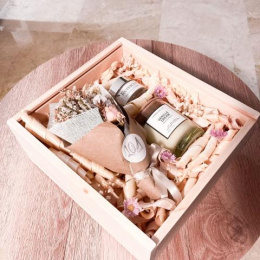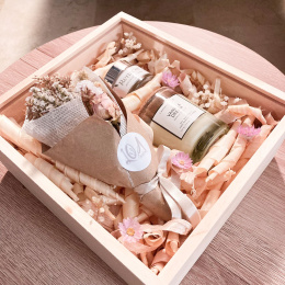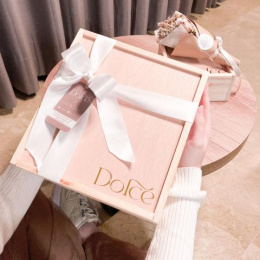• Caja elaborada madera de pino con logo Dolce Gift Box en letras doradas