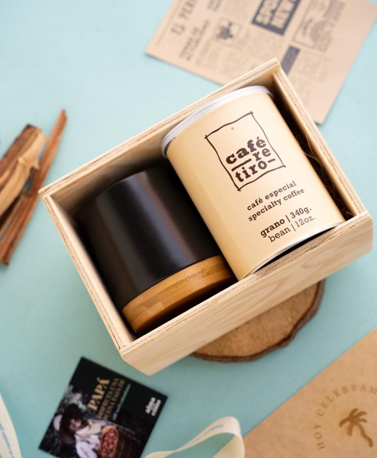 Este kit premium de café será el acompañante perfecto para esa persona amante del café. Esta taza en cerámica y bambú será su nueva favorita para iniciar los días. Este kit incluye: Taza en cerámica con base en bambú, café edición especial de café retiro 340gr, elaborado con procesos artesanales por familias caficultoras, con suaves notas a chocolate, frutos rojos y caramelo. Y lo mejor de todo, podrá acompañar su cafecito con un periódico escrito especialmente para él, para celebrar su día. Caja en madera con grabado láser.