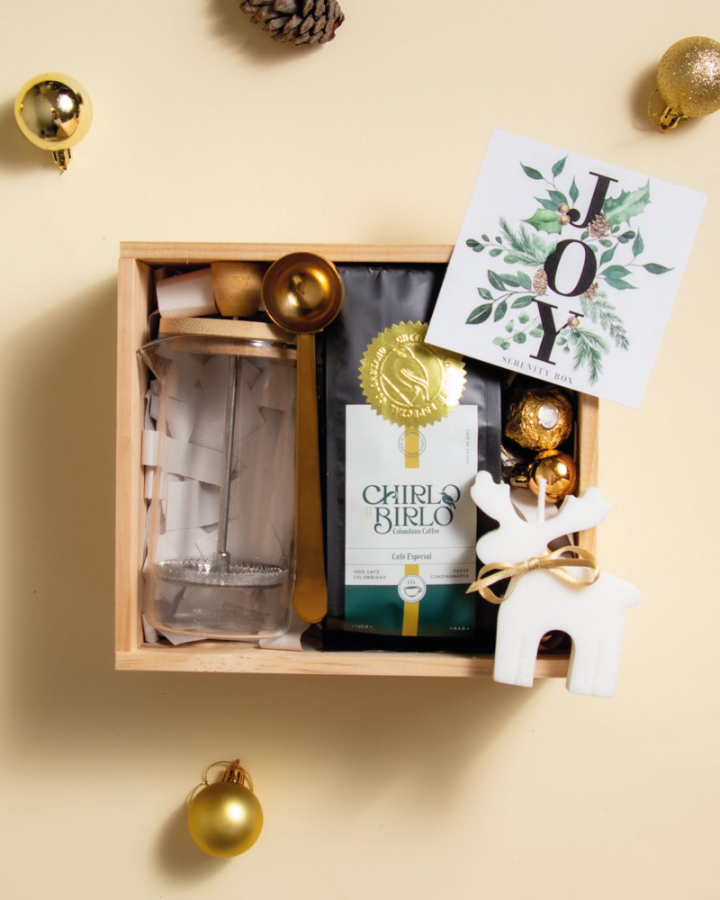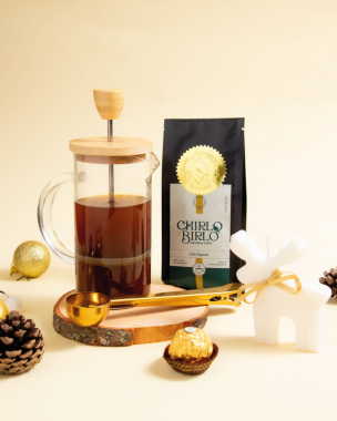 Este kit incluye: – Prensa de café 350 ml – Café de especialidad Chirlo Birlo 125 gr – Cuchara dosificadora de café con clip de sellado – Vela en forma de reno -Chocolate ferrero – Caja de madera – Postal y decoración de navidad
