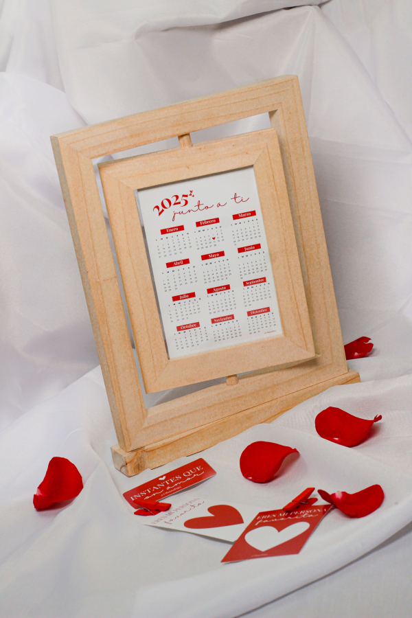 Cuadro giratorio con base de madera en pino y cubierta de vidrio, con un diseño exclusivo de San Valentín en la parte frontal. En la parte trasera, encontrarás el calendario 2025, simbolizando un año lleno de momentos especiales. Incluye empaque lleno de amor y tarjeta de San Valentín.