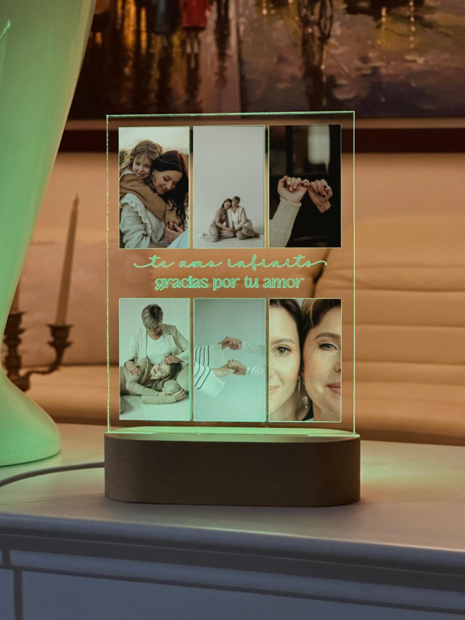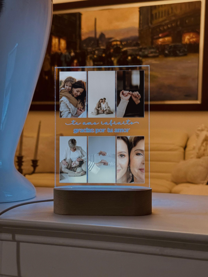 Nuestra lámpara personalizada es el regalo perfecto para revivir tus mejores momentos. Para diseñarla, solo necesitas 6 fotos y un mensaje especial que los haga inolvidables.