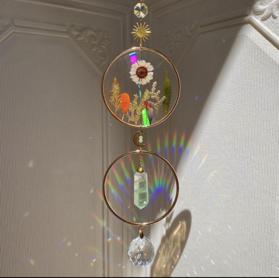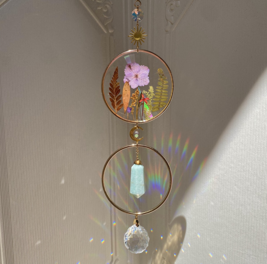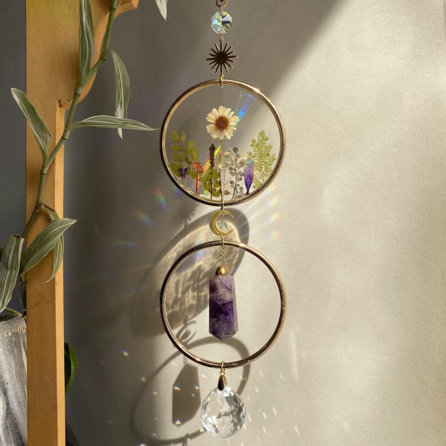 Atrapasol con plantas reales prensadas, resina iridiscente, apliques en acero inoxidable, obelisco mineral natural y cristales iridiscentes.