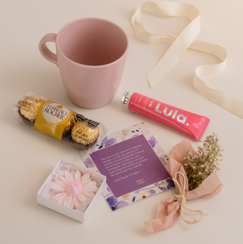 Consiente a mamá en su día con un detalle lleno de amor, pensado para hacerla sonreír y recordarle lo especial que es en tu vida. Este hermoso kit incluye Ferrero x3, un mug cerámico, crema hidratante de manos, una vela artesanal en forma de flor y un delicado bouquet de flores secas, creando una experiencia dulce y llena de encanto.