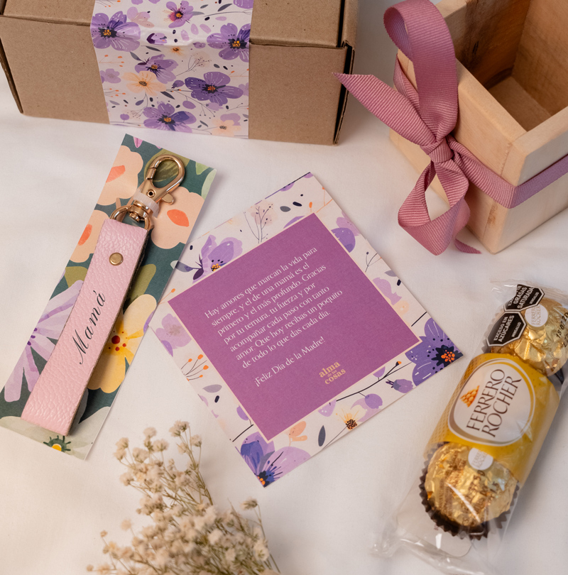 Sorprende a mamá con un detalle único y lleno de significado. Este kit viene en una caja de madera súper especial, ideal para guardar recuerdos, e incluye chocolates Ferrero Rocher x3 unidades, un delicado bouquet de flores secas y un llavero en cuero con la palabra MAMÁ, perfecto para acompañarla todos los días.
